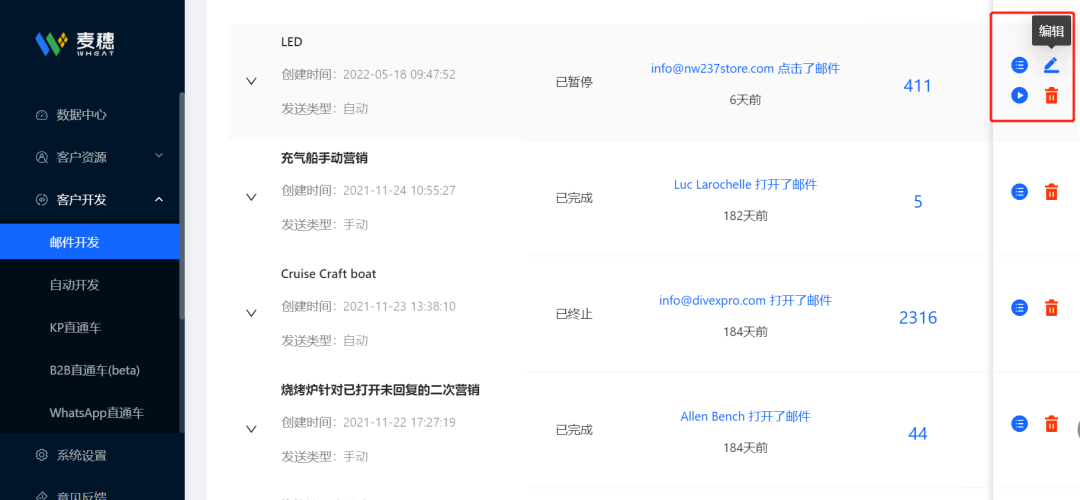 想要了解每天的开发情况,进入客户开发下的邮件开发,可查看自动开发任务情况。
